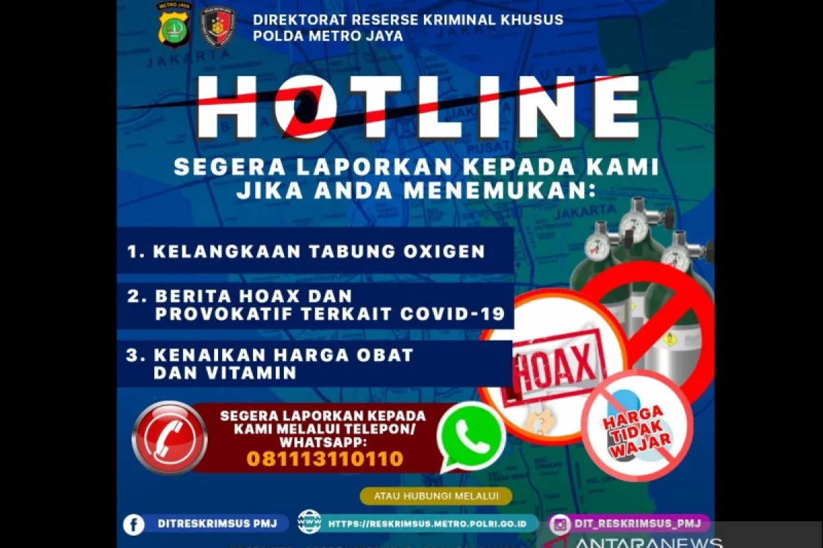 Jakarta (ANTARA) - Direktorat Reserse Kriminal Khusus Polda Metro Jaya membuka "hotline" untuk pengaduan dan laporan seputar penimbunan dan kenaikan harga tabung oksigen, obat dan vitamin serta hoaks terkait pandemi COVID-19.