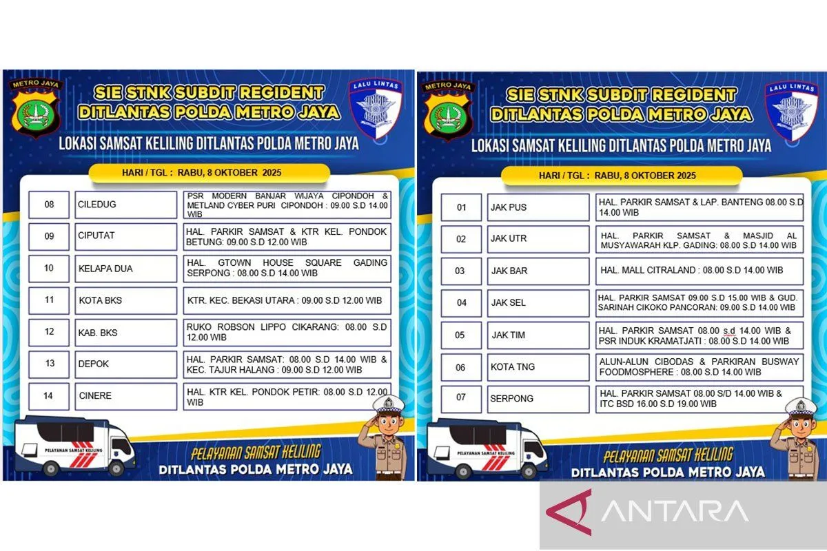 Jakarta (ANTARA) - Polda Metro Jaya menyediakan layanan Sistem Administrasi Manunggal Satu Atap (Samsat) Keliling di 14 lokasi di wilayah Jakarta, Depok, Tangerang dan Bekasi (Jadetabek) pada Rabu untuk memudahkan masyarakat dalam membayar pajak kendaraan bermotor (PKB).