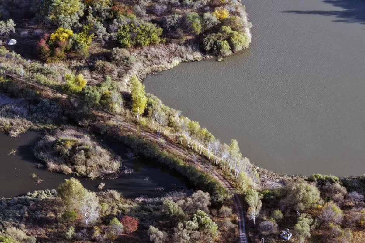 Foto udara drone yang diambil pada 7 Oktober 2025 menunjukkan pemandangan musim gugur di Taman Nasional Lahan Basah Taiyangdao (Pulau Matahari) di Harbin, Provinsi Heilongjiang, China timur laut. (Xinhua/Wang Song)