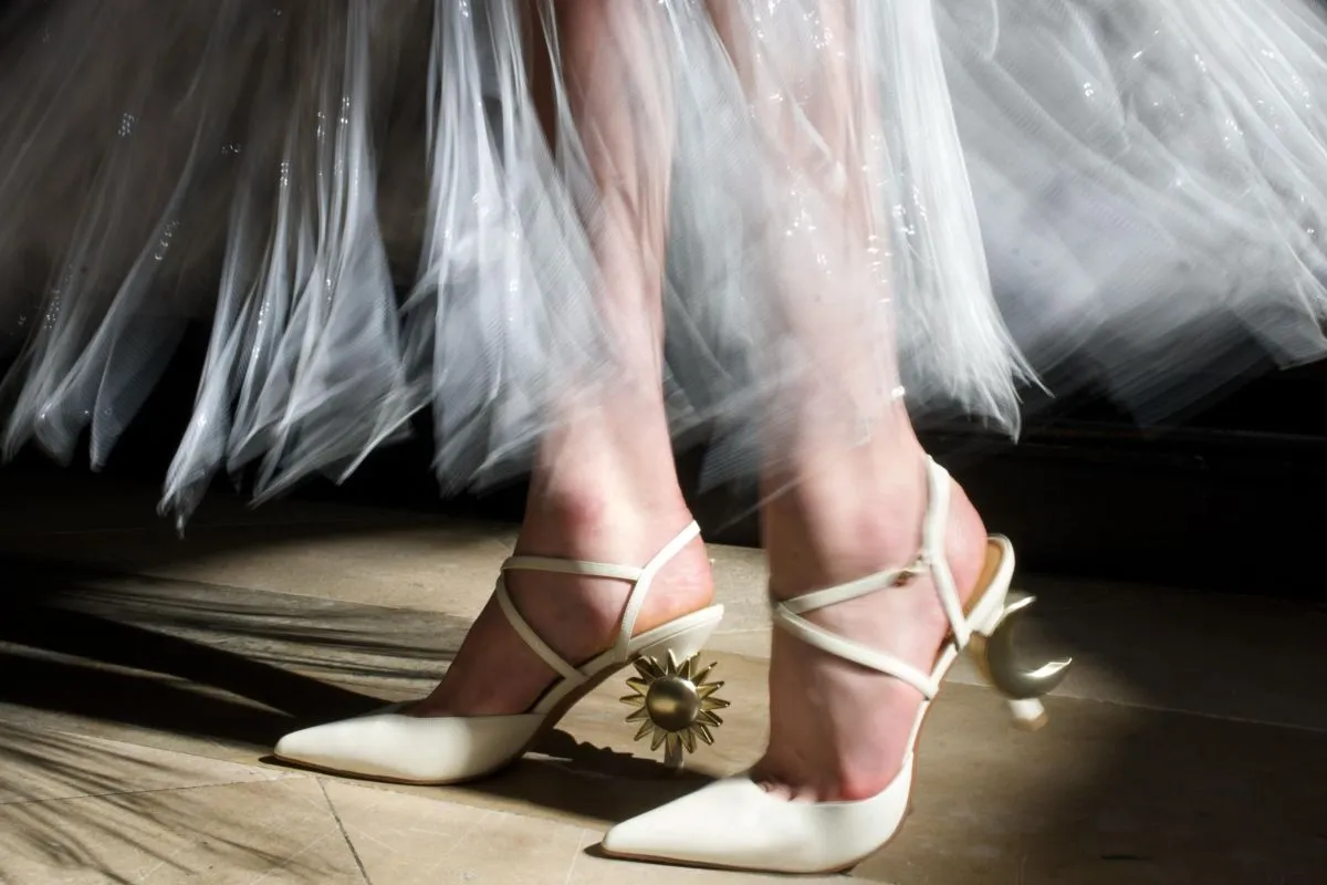 Beberapa desain menonjol di runway, seperti pump berujung lancip berwarna oranye terang dengan hak berbentuk bulan sabit dan loafers satin putih dengan detail logam. Perpaduan bahan satin dan kulit lembut dengan tali silang tipis menegaskan perhatian merek itu pada kenyamanan dan estetika secara bersamaan.