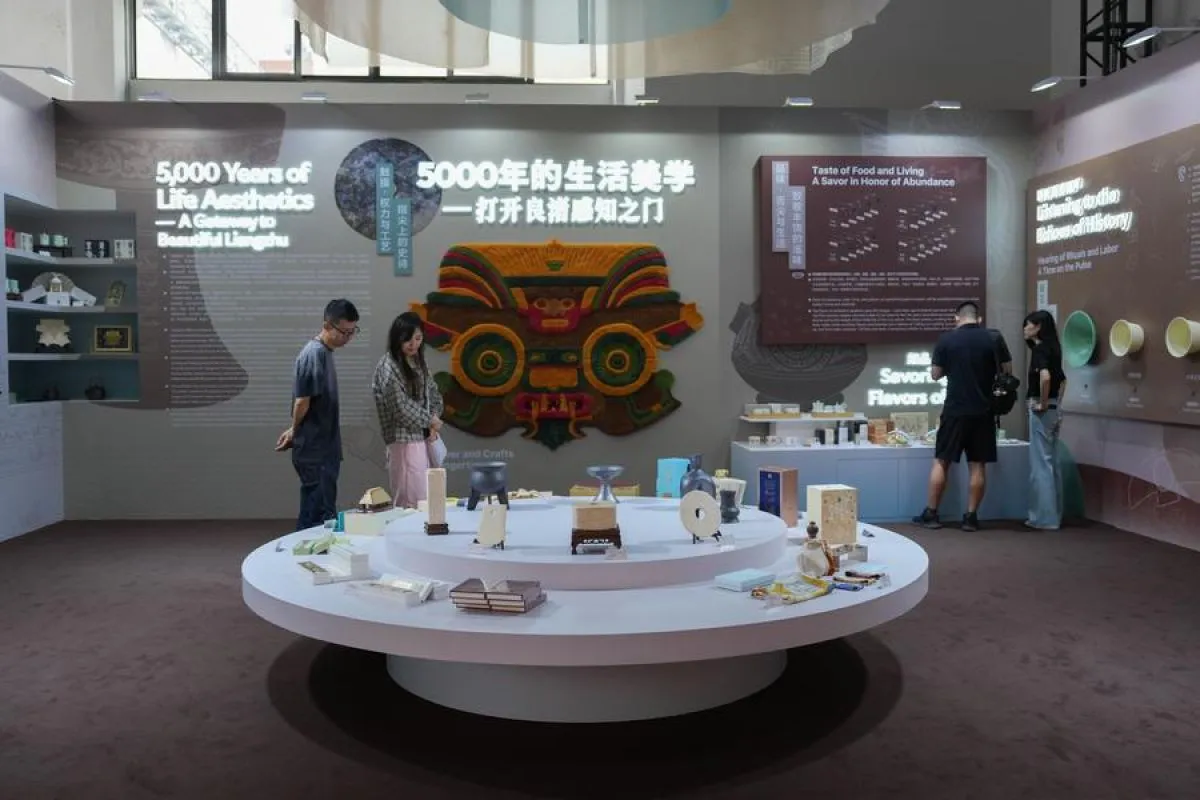 Orang-orang mengunjungi stan Museum Istana di Liangzhu Cultural and Creative Bazaar di Hangzhou, Provinsi Zhejiang, China timur, 17 Oktober 2025. ANTARA/Xinhua/Huang Zongzhi