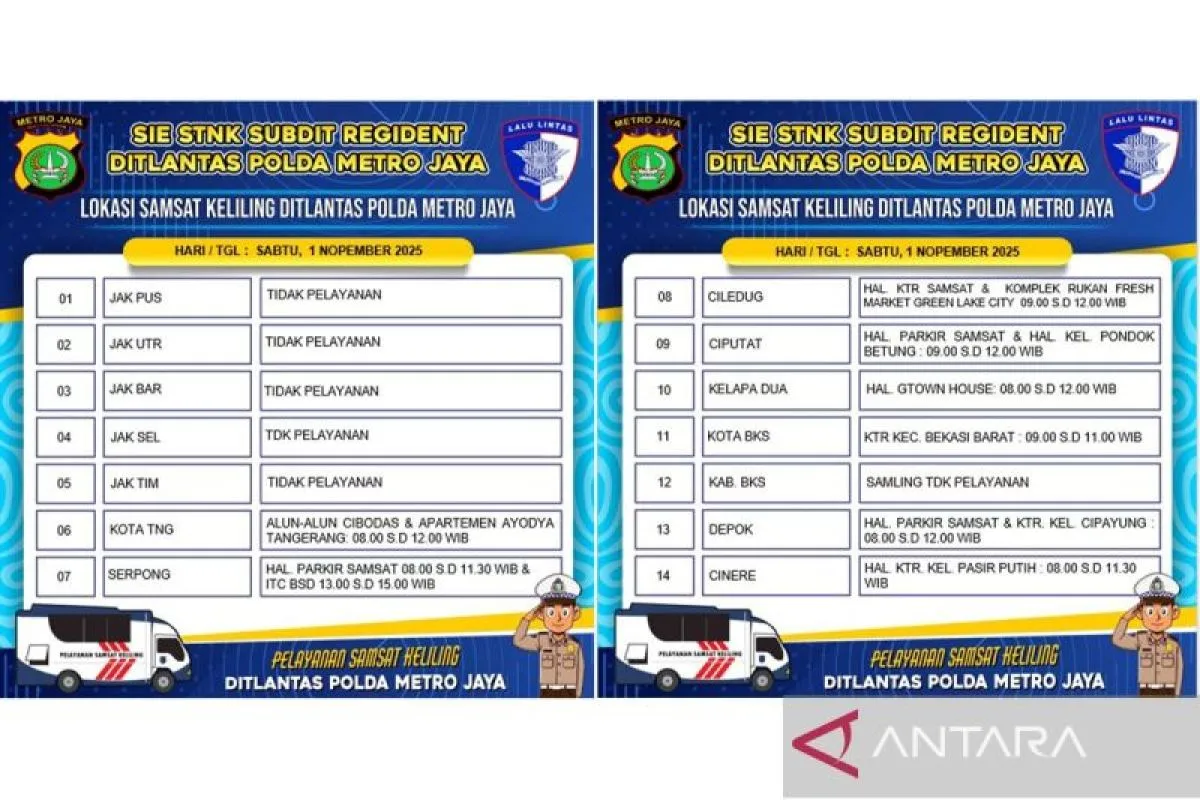 Jakarta (ANTARA) - Polda Metro Jaya menyediakan layanan Sistem Administrasi Manunggal Satu Atap (Samsat) Keliling untuk memudahkan masyarakat dalam pembayaran pajak kendaraan bermotor (PKB) di delapan lokasi di wilayah Depok, Tangerang dan Bekasi pada Sabtu.