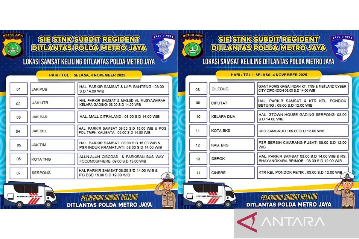 Jakarta (ANTARA) - Polda Metro Jaya menyediakan layanan Sistem Administrasi Manunggal Satu Atap (Samsat) Keliling untuk membantu para wajib pajak dalam membayar pajak kendaraan bermotor (PKB) di 14 wilayah Jakarta, Depok, Tangerang dan Bekasi (Jadetabek), Selasa.