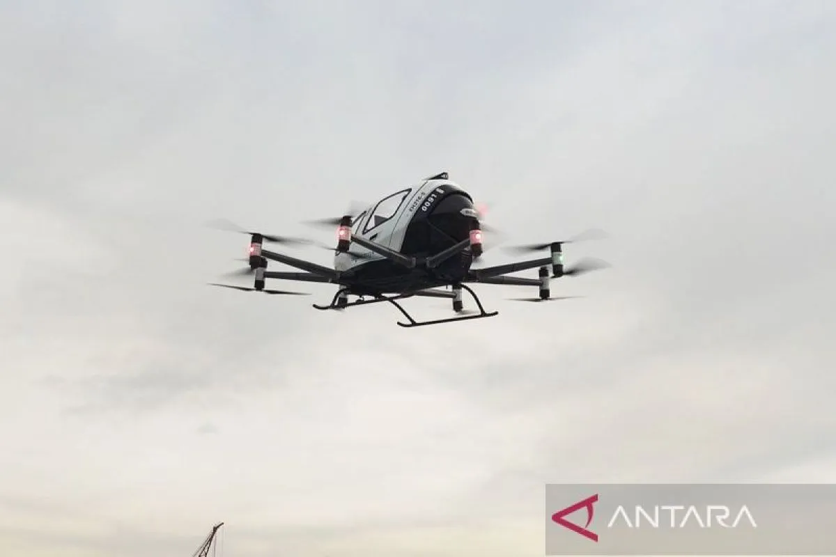 Satu pesawat tanpa awak mirip "drone" raksasa dari produsen taksi terbang EHang melayang, berdengung berisik seperti ribuan kumbang bersatu di atas zona inovasi tepi sungai di pinggiran pusat bisnis Guangzhou di China bagian selatan pada akhir November 2025 lalu.