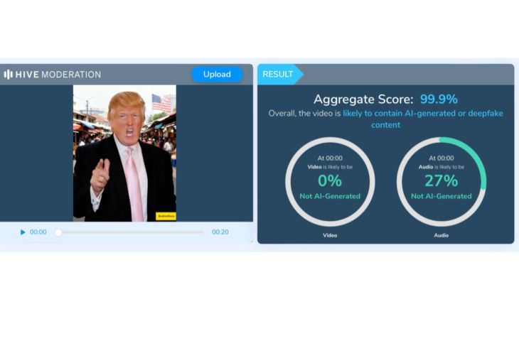 ANTARA melakukan pemeriksaan menggunakan AI Detector Hive Moderation, dan hasil analisis menunjukkan bahwa 99,9 persen konten video tersebut terindikasi sebagai buatan AI.