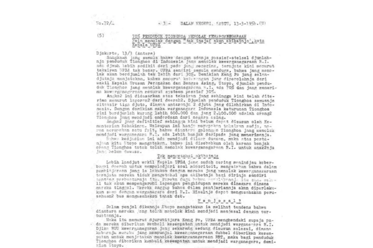 Demikian Keng Po jang selandjutnja menjatakan, bahwa menurut keterangan jang diperolehnja dari wakil Kepala Urusan Peranakan dan Bangsa Asing (UPBA), Utoyo, djumlah penduduk Tionghoa jang menolak kewarganegaraan R.I. ada 70% dan jang menerima kewarganegaraan menurut systeem passief 30%.