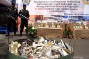 Petugas berjaga di dekat barang bukti sitaan Bea Cukai Wilayah Sulawesi Bagian Selatan (Subagsel) sebelum dimusnahkan di halaman kantor Balai Diklat Keuangan Makassar, Sulawesi Selatan, Rabu (30/10/2019). Bea Cukai Wilayah Subagsel memusnahkan barang bukti sitaan selama tahun 2018-2019 sebanyak 21.200.452 batang rokok dan 1.744 botol miras ilegal dengan nilai Rp12.874.582.580 dengan potensi kerugian negara Rp6.126.759.520. ANTARA FOTO/Arnas Padda/YU/hp.