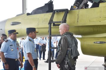 Kepala Staf TNI Angkatan Udara Marsekal TNI Yuyu Sutisna (kanan) menyalami penerbang dari pabrik pesawat Lockheed Martin Amerika Serikat seusai Ôtest flightÕ perdana pesawat tempur F-16 setelah menjalani ÔupgradeÕ di Lanud Iswahjudi Magetan, Jawa Timur, Selasa (18/2/2020). KSAU meninjau kegiatan upgrade pesawat tempur F-16 oleh para teknisi TNI AU dan PT Dirgantara Indonesia dibawah supervisi Lockheed Martin, dan satu dari 10 unit selesai di-upgrade dan berhasil menjalani Ôtest flightÕ oleh penerbang dari Lockheed Martin. ANTARA FOTO/Siswowidodo/ama.
