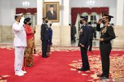 Presiden Joko Widodo (kanan) memberikan ucapan kepada Kepala Staf Angkatan Udara (KSAU) Marsekal TNI Fadjar Prasetyo (kiri) seusai dilantik di Istana Negara, Jakarta, Rabu (20/05/2020). Presiden Joko Widodo secara resmi melantik Laksamana TNI Yudo Margono sebagai KSAL dan Marsekal TNI Fadjar Prasetyo sebagai KSAU. ANTARA FOTO/Hafidz Mubarak A/POOL/hp.