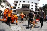 Petugas mengikuti simulasi bencana gempa saat Hari Kesiapsiagaan Bencana di Balai Kota Solo, Jawa Tengah, Senin (26/4/2021). Simulasi yang melibatkan Polisi, TNI, SAR, PMI, PNS dan relawan tersebut bertujuan untuk melatih kesiapan dan kesigapan menghadapi musibah bencana gempa. ANTARA FOTO/Maulana Surya/wsj.