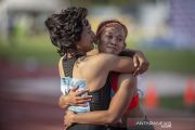 Pelari Jawa Barat Tyas Murtiningsih (kanan) berpelukan dengan pelari Jawa Barat lainnya, Erna Nuryanti (kiri) usai memenangi final nomor lari 100 meter putri PON Papua di Stadion Atletik Mimika Sport Center, Kabupaten Mimika, Papua, Rabu (6/10/2021). Tyas meraih medali emas, sementara pelari Jabar lainnya Erna Nuryanti meraih medali perak dan pelari Bengkulu Hasruni meraih medali perunggu. ANTARA FOTO/Aditya Pradana Putra/pras.