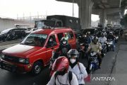Sejumlah motor yang akan menuju Jakarta melawan arus lalu lintas untuk menghindari kemacetan di Jalan I Gusti Ngurah Rai, Bekasi, Jawa Barat, Senin (19/9/2022). Pemerintah Provinsi DKI Jakarta merancang uji publik yang melibatkan instansi pemerintah pusat, daerah dan asosiasi terkait usulan pengaturan jam kerja, untuk menekan kemacetan jalanan yang saat ini telah mencapai 48 persen. ANTARA FOTO/ Fakhri Hermansyah/aww.