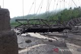Kondisi Jembatan Gantung Kali Regoyo yang putus diterjang banjir lahar hujan di Sumber Wuluh, Lumajang, Jawa Timur, Jumat (7/7/2023). Akibat banjir lahar hujan Gunung Semeru tersebut menyebabkan sejumlah jembatan putus sehingga akses jalur Lumajang-Malang putus. ANTARA FOTO/Rohcmad/Spt.