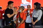 Ketua Umum Partai Solidaritas Indonesia (PSI) Kaesang Pangarep (kiri) didampingi istri Erina Gudono (kanan) berbincang dengan simpatisan saat kampanye akbar di Denpasar, Bali, Senin (5/2/2024). Dalam kampanye itu Kaesang Pangarep mengajak masyarakat untuk memenangkan dan memilih calon legislatif dari PSI serta memenangkan pasangan Prabowo Subianto-Gibran Rakabuming Raka satu putaran pada Pemilu 2024. ANTARA FOTO/Fikri Yusuf/aww.