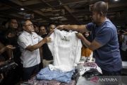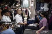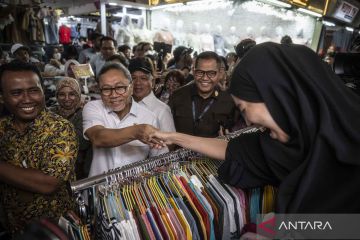 Menteri Perdagangan Zulkifli Hasan (kedua kiri) melihat baju yang ditawarkan pedagang saat berkunjung di Blok A Pasar Tanah Abang, Jakarta, Kamis (14/3/2024). Kunjungan tersebut dalam rangka memantau aktivitas perdagangan selama Ramadhan dan kesiapan menjelang Idul Fitri 2024. ANTARA FOTO/Aprillio Akbar/YU