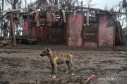 Seekor anjing berada di depan rumah yang rusak parah terdampak erupsi Gunung Ruang di Desa Laingpatehi Pulau Ruang, Kabupaten Kepulauan Sitaro, Sulawesi Utara, Jumat (3/5/2024). Dua desa yang berada di bawah kaki Gunung Ruang yaitu Desa Laingpatehi dan Desa Pumpente menjadi desa paling parah terkena dampak letusan Gunung Ruang dan puluhan rumah di lokasi tersebut tertimbun material abu vulkanik. ANTARA FOTO/Andri Saputra/nym.