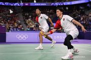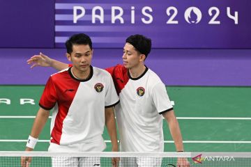 Pebulu tangkis ganda putra Indonesia Fajar Alfian (kanan) dan Muhammad Rian Ardianto saat gagal meraih poin saat bertanding dengan ganda putra China Liang Wei Keng/Wang Chang pada babak perempat final Olimpiade Paris 2024 di Porte De La Chapella Arena, Paris, Prancis, Kamis (1/8/2024). Fajar/Rian gagal melaju ke babak selanjutnya setelah kalah dengan dua gim langsung 22-24, 20-22. ANTARA FOTO/Wahyu Putro A/aww.