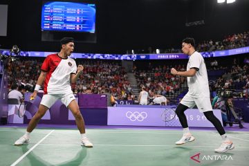Pebulu tangkis ganda putra Indonesia Fajar Alfian (kiri) dan Muhammad Rian Ardianto bereaksi usai meraih poin dari ganda putra China Liang Wei Keng/Wang Chang pada babak perempat final Olimpiade Paris 2024 di Porte De La Chapella Arena, Paris, Prancis, Kamis (1/8/2024). Fajar/Rian gagal melaju ke babak selanjutnya setelah kalah dengan dua gim langsung 22-24, 20-22. ANTARA FOTO/Wahyu Putro A/aww.