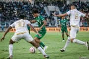 Pesepak bola PSS Sleman Paulo Oktavianus Sitanggang (tengah) menguasai bola dibayangi dua pesepak bola Arema FC Salim Akbar Tuharea (kiri) dan Sneyder Julian Guevara Munoz (kanan) saat pertandingan BRI Liga I 2024/2025 di Stadion Manahan, Solo, Jawa Tengah, Jumat (20/9/2024). PSS Sleman menang atas Arema FC dengan skor 3-1. ANTARA FOTO/Mohammad Ayudha/agr