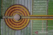 Foto udara lahan holtikultura milik petani yang ditanami bunga refugia di Desa Kedungrejo, Lumajang, Jawa Timur, Kamis (19/9/2024). Penanaman aneka jenis bunga refugia di sekitar lahan holtikultura tersebut guna mencegah serangan hama sayur-sayuran sekaligus mengurangi penggunaan pestisida hingga 50 persen. ANTARA FOTO/Irfan Sumanjaya/Spt.