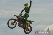Pembalap motor Jawa Timur M. Zidane Alnesa Pratama melakukan lompatan selebrasi usai finis pada balap motor grasstrack standart perorangan PON XXI Aceh-Sumut di Sirkuit GTX Sena Kualanamu Sumut, Deli Serdang, Sumatera Utara, Senin (16/9/2024). M. Zidane Alnesaa Pratama meraih medali emas dengan catatan waktu 15 menit 30 detik, medali perak diraih pembalap Jambi Reyfaldo Iwanggara Bilqi dengan catatan waktu 15 menit 46 detik, dan pembalap Sumatera Selatan Galang Fernando Julianto meraih medali perunggu dengan catatan waktu 15 menit 49 detik. ANTARA FOTO/Makna Zaezar/Spt.