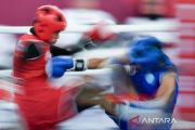 Atlet Lampung Aini Sevi (kiri) melancarkan serangan kepada atlet Sulut Pesik Novia (kanan) pada semifinal kickboxing kategori Low kick (LK) 48 kilogram putri PON XXI Aceh-Sumut 2024 di GOR Veteran, Medan, Sumatera Utara, Rabu (18/9/2024). Lampung menang atas Sulut dengan skor 3-0. ANTARA FOTO/Iggoy el Fitra/Spt.
