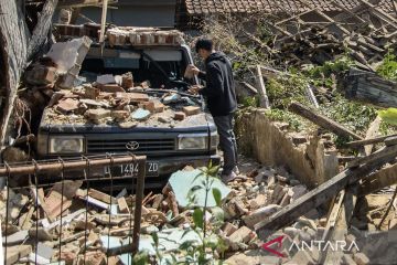 Warga membersihkan puing rumah yang runtuh pascagempa bumi di Desa Cibeureum, Kertasari, Kabupaten Bandung, Jawa Barat, Rabu (18/9/2024). Menurut data sementara BPBD Provinsi Jawa Barat, gempa berkekuatan 5.0 Magnitudo tersebut mengakibatkan 8 unit rumah, 2 fasilitas kesehatan, 1 sarana pendidikan, dan 1 tempat ibadah mengalami kerusakan. ANTARA FOTO/Novrian Arbi/Spt.