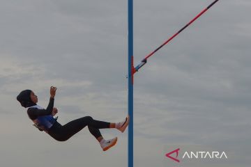 Atlet Jawa Barat Beby Alia Putri melakukan lompatan pada final lompat tinggi galah putri PON XXI Aceh-Sumut 2024 di Stadion Madya Atletik Sumut Sport Center, Deli Serdang, Sumatera Utara, Rabu (18/9/2024). Medali emas diraih atelt DKI Jakarta Diva Renatta dengan tinggi lompatan 4,20 meter sekaligus memecahkan rekor nasional. ANTARA FOTO/Yulius Satria Wijaya/Spt.
