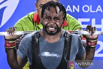Lifter Papua Pegunungan Arni Lokobal melakukan angkatan squat pada angkat berat kelas 83 kg putra PON XXI Aceh-Sumut 2024 di GOR Seuramoe Angkat Besi Stadion Harapan Bangsa, Banda Aceh, Aceh, Selasa (17/9/2024). Lifter Riau Andre Satria berhasil meraih medali emas dengan total angkatan 915,5 kg sedangkan medali perak diraih lifter Lampung Viki Aryanto dengan total angkatan 868 kg dan medali perunggu diraih lifter Jawa Barat M Yusuf dengan total angkatan 850 kg. ANTARA FOTO/Aprillio Akbar/Spt.