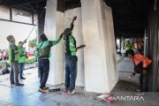 Sejumlah pengemudi ojek daring mengecat Halte Senen Sentral di Jakarta, Senin (1/9/2025). Pemprov DKI Jakarta menggelar aksi Gotong Royong Gerak Cepat Jaga Jakarta bersama sejumlah pelajar, pengemudi ojek daring, dan petugas gabungan untuk membersihkan sejumlah fasilitas umum seperti halte Transjakarta yang terbakar dan diharapkan dapat kembali membuka layanan pada pekan depan. ANTARA FOTO/Sulthony Hasanuddin/tom.