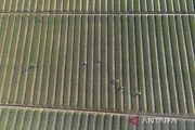 Foto udara petani menyiram tanaman bawang mewah di Kertajati, Majalengka, Jawa Barat, Selasa (23/9/2025). Kementerian Pertanian (Kementan) menyebut pemerintah membutuhkan investasi senilai Rp371,6 triliun untuk mendorong hilirisasi sektor pertanian yang mayoritas diperuntukkan untuk kebutuhan kredit usaha rakyat (KUR) petani. ANTARA FOTO/Dedhez Anggara/YU