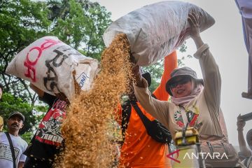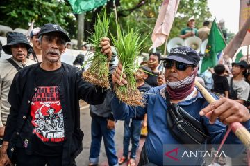 Pengunjuk rasa melakukan aksi Hari Pangan Sedunia di Jalan Medan Merdeka Selatan, Jakarta, Kamis (16/10/2025). Aksi tersebut bertujuan untuk menegaskan kembali bahwa reforma agraria adalah sebuah kunci untuk mewujudkan kedaulatan pangan di Indonesia. ANTARA FOTO/Rivan Awal Lingga/rwa.