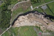Foto udara kondisi longsoran tanah yang membetnuk lubang raksasa di Desa Pondok Balik, Kabupaten Aceh Tengah, Aceh, Jumat (20/2/2026). Longsoran tanah yang membentuk lubang raksasa hingga lebih dari 30 ribu meter persegi tersebut memutus akses antarkecamatan di Aceh Tengah dan menenggelamkan lahan perkebunan warga setempat. ANTARA FOTO/Arnas Padda/nym.