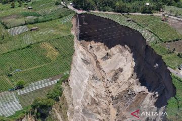 Foto udara jalan penghubung antarkecamatan yang putus akibat longsoran tanah di Desa Pondok Balik, Kabupaten Aceh Tengah, Aceh, Jumat (20/2/2026). Longsoran tanah yang membentuk lubang raksasa hingga lebih dari 30 ribu meter persegi tersebut memutus akses antarkecamatan di Aceh Tengah dan menenggelamkan lahan perkebunan warga setempat. ANTARA FOTO/Arnas Padda/nym.
