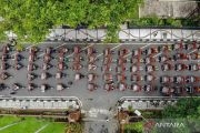 Foto udara sejumlah pengemudi becak lansia bersiap membawa pulang becak listrik bantuan dari Presiden Prabowo Subianto di depan Pendopo KRT. Sosro Koesoemo, Nganjuk, Jawa Timur, Kamis (26/2/2026). Sebanyak 220 unit becak listrik produksi PT Pindad tersebut disalurkan melalui Yayasan Gerakan Solidaritas Nasional sebagai upaya meningkatkan kesejahteraan serta mendukung mobilitas kerja tukang becak lansia agar tetap produktif dan lebih ramah lingkungan. ANTARA FOTO/Muhammad Mada/YU