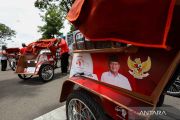 Sejumlah tukang becak mengendarai becak listrik bantuan dari Presiden Prabowo Subianto di depan Pendopo KRT. Sosro Koesoemo, Nganjuk, Jawa Timur, Kamis (26/2/2026). Sebanyak 220 unit becak listrik produksi PT Pindad tersebut disalurkan melalui Yayasan Gerakan Solidaritas Nasional sebagai upaya meningkatkan kesejahteraan serta mendukung mobilitas kerja tukang becak lansia agar tetap produktif dan lebih ramah lingkungan. ANTARA FOTO/Muhammad Mada/YU