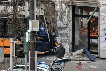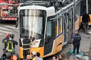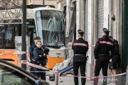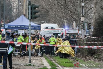Petugas berjaga di lokasi kecelakaan trem anjlok di Milan, Italia, Jumat (27/2/2026). Dalam kejadian tersebut satu orang tewas dan puluhan lainnya luka-luka. ANTARA FOTO/Xinhua/agr