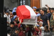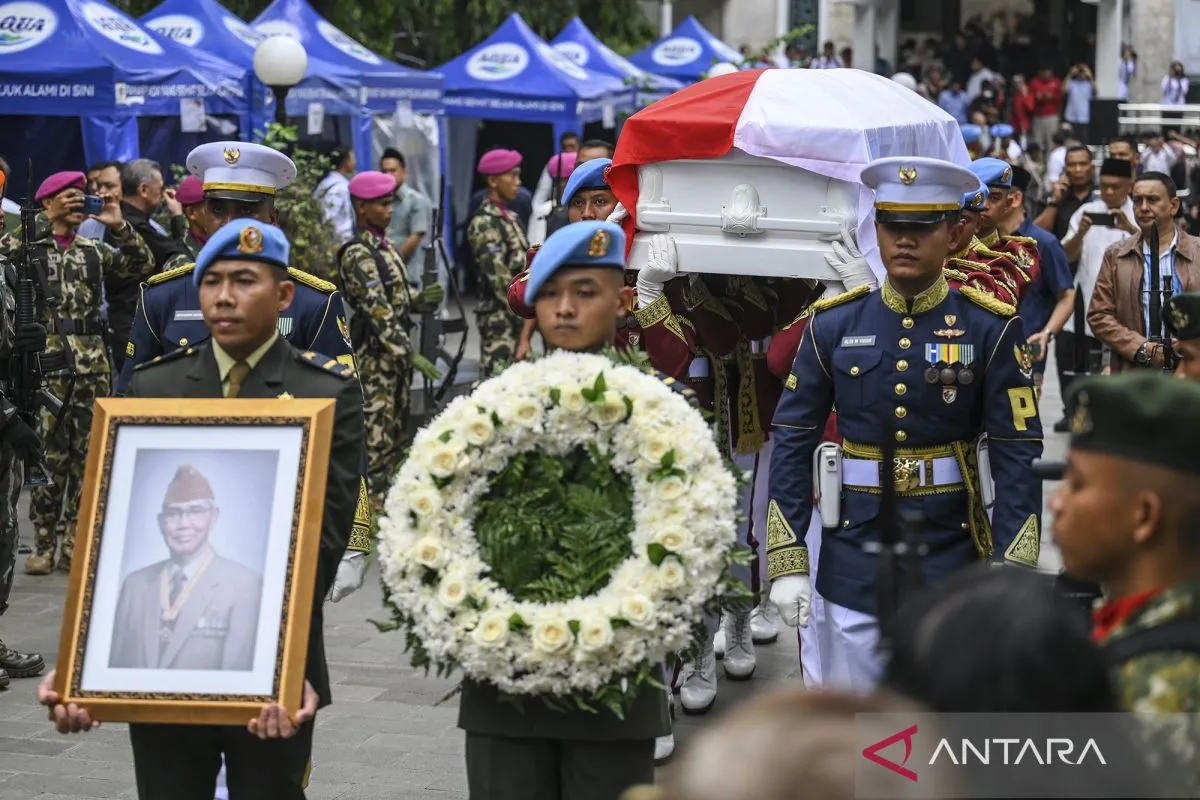 Personel Paspampres membawa jenazah Wakil Presiden ke-6 Try Sutrisno saat upacara penyerahan jenazah ke negara di Masjid Agung Sunda Kelapa, Jakarta, Senin (2/3/2026). Try Sutrisno wafat di Rumah Sakit Pusat Angkatan Darat (RSPAD) Gatot Soebroto, Jakarta, pada Senin (2/3) di usia 90 tahun. ANTARA FOTO/Hafidz Mubarak A/bar