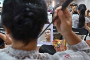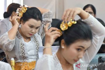 Peserta mengikuti pelatihan tata rias dan sanggul di Denpasar, Bali, Rabu (11/3/2026). Pelatihan tersebut diselenggarakan sebagai upaya pemberdayaan para perempuan berbagai usia khususnya dalam bidang ekonomi melalui keahlian tata rias serta sanggul yang relevan dengan kebutuhan kegiatan adat dan sosial di Bali. ANTARA FOTO/Fikri Yusuf/nym.