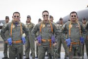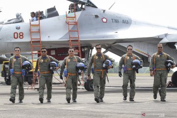 KSAU Marsekal TNI Yuyu Sutisna (kiri), KSAL Laksamana TNI Siwi Sukma Adji (ketiga kiri) dan KSAD Jenderal TNI Andika Perkasa (kedua kanan) bersiap mengikuti "Joy Flight" di Lanud Halim Perdanakusuma, Jakarta, Jumat (5/4/2019). Kegiatan tersebut merupakan bagian dari pemberian Wing Penerbang Kehormatan kepada KSAD Jenderal TNI Andika Perkasa dan KSAL Laksamana TNI Siwi Sukma Adji sebagai penghargaan atas kerja sama dan dukungan kepada TNI Angkatan Udara. ANTARA FOTO/Dhemas Reviyanto/wsj.