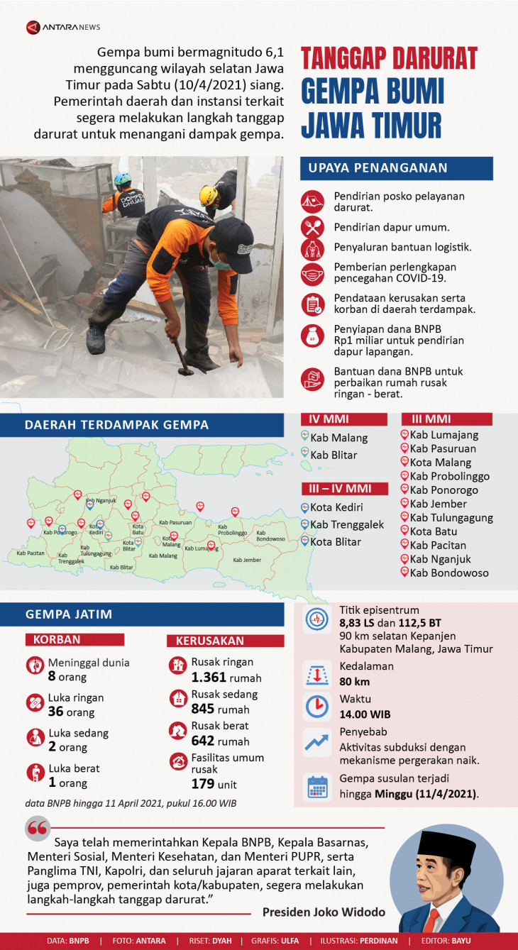 Gempa bumi bermagnitudo 6,1 mengguncang wilayah selatan Jawa Timur pada Sabtu (10/4/2021) siang. Pemerintah daerah dan instansi terkait segera melakukan langkah tanggap darurat untuk menangani dampak gempa.