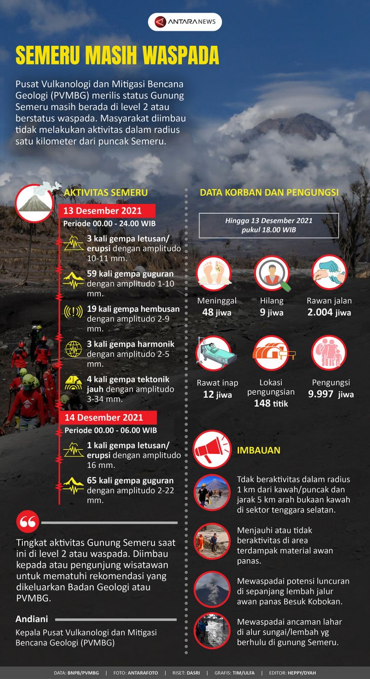 Pusat Vulkanologi dan Mitigasi Bencana Geologi (PVMBG) merilis status Gunung Semeru masih berada di level 2 atau berstatus waspada. Masyarakat diimbau tidak melakukan aktivitas dalam radius satu kilometer dari puncak Semeru.