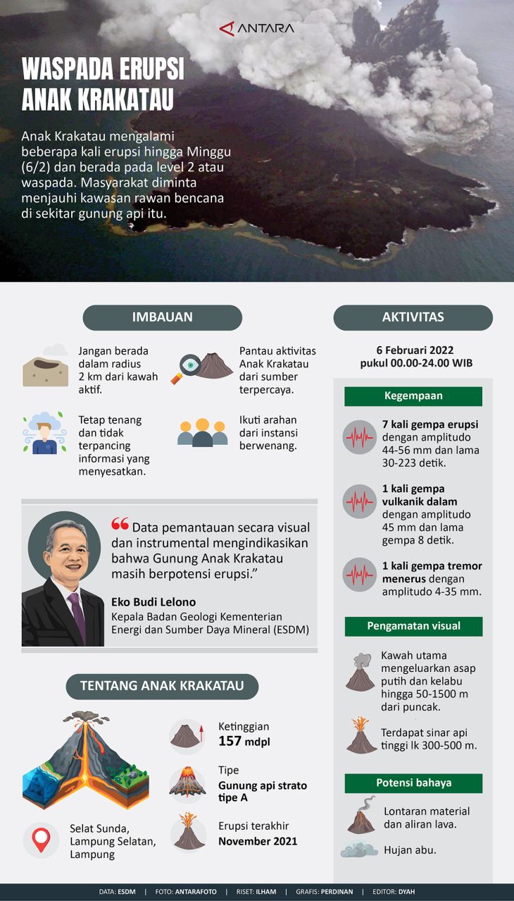 Anak Krakatau mengalami beberapa kali erupsi hingga Minggu (6/2) dan berada pada level 2 atau waspada. Masyarakat diminta menjauhi kawasan rawan bencana di sekitar gunung api itu.