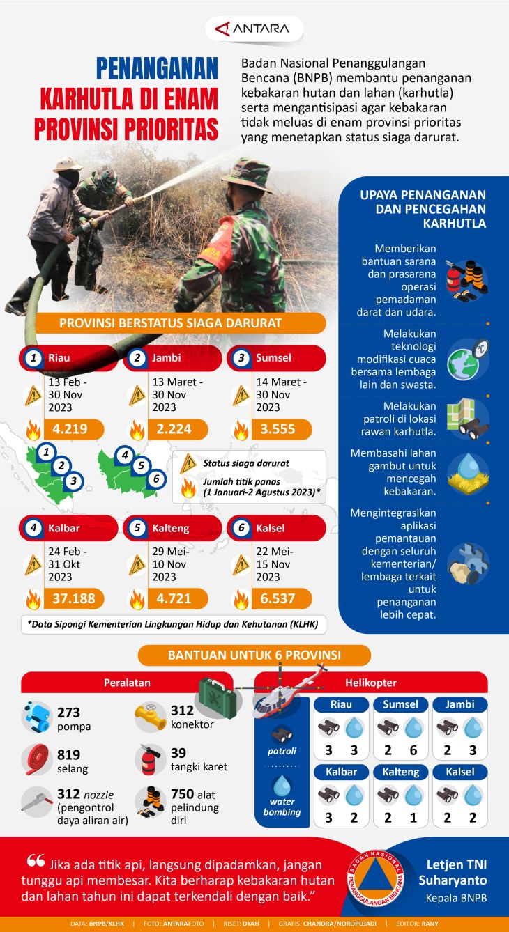 Badan Nasional Penanggulangan Bencana (BNPB) membantu penanganan kebakaran hutan dan lahan (karhutla) serta mengantisipasi agar kebakaran tidak meluas di enam provinsi prioritas yang menetapkan status siaga darurat.