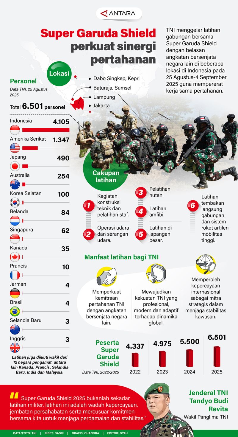 TNI menggelar latihan gabungan bersama Super Garuda Shield dengan belasan angkatan bersenjata negara lain di beberapa lokasi di Indonesia pada 25 Agustus-4 September 2025 guna mempererat kerja sama pertahanan.