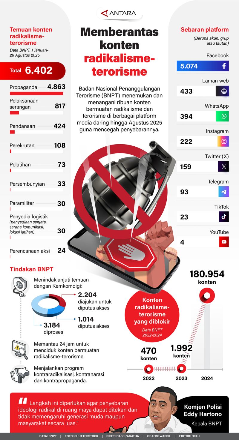 Badan Nasional Penanggulangan Terorisme (BNPT) menemukan dan menangani ribuan konten bermuatan radikalisme dan terorisme di berbagai platform media daring hingga Agustus 2025 guna mencegah penyebarannya.