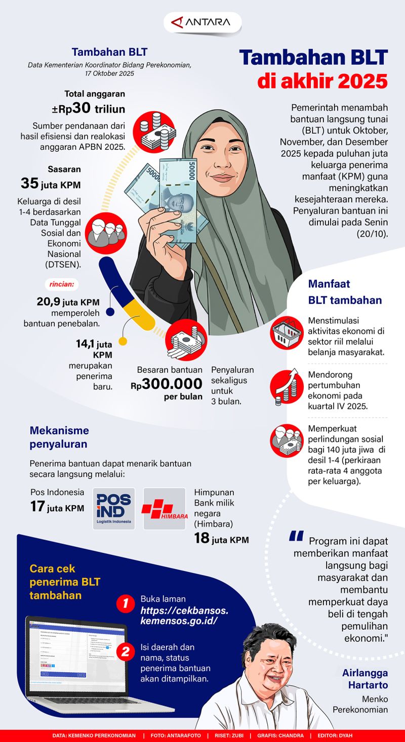 Pemerintah menambah bantuan langsung tunai (BLT) untuk Oktober, November, dan Desember 2025 kepada puluhan juta keluarga penerima manfaat (KPM) guna meningkatkan kesejahteraan mereka. Penyaluran bantuan ini dimulai pada Senin (20/10).