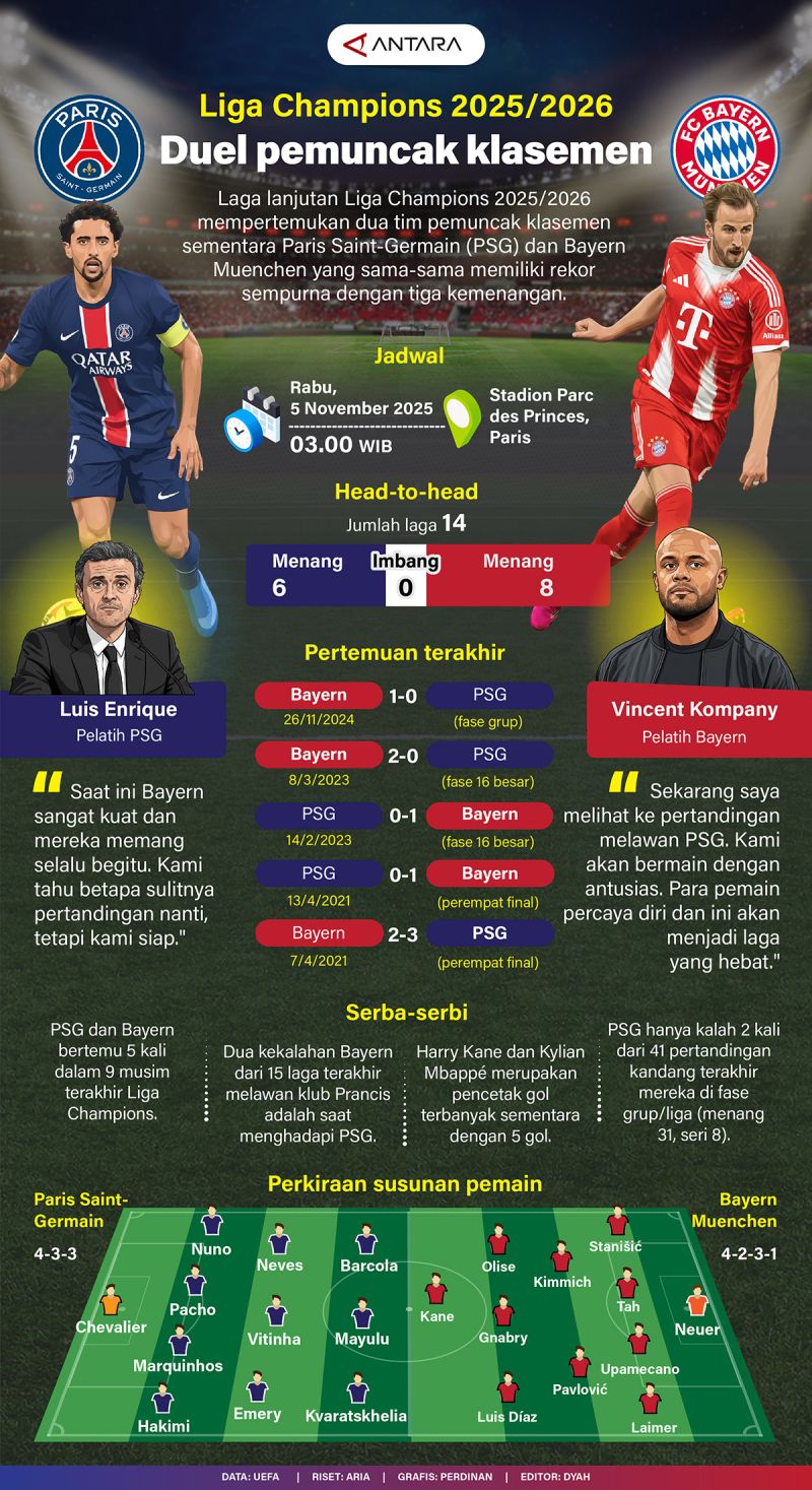 Laga lanjutan Liga Champions 2025/2026 mempertemukan dua tim pemuncak klasemen sementara Paris Saint-Germain (PSG) dan Bayern Muenchen yang sama-sama memiliki rekor sempurna dengan tiga kemenangan.