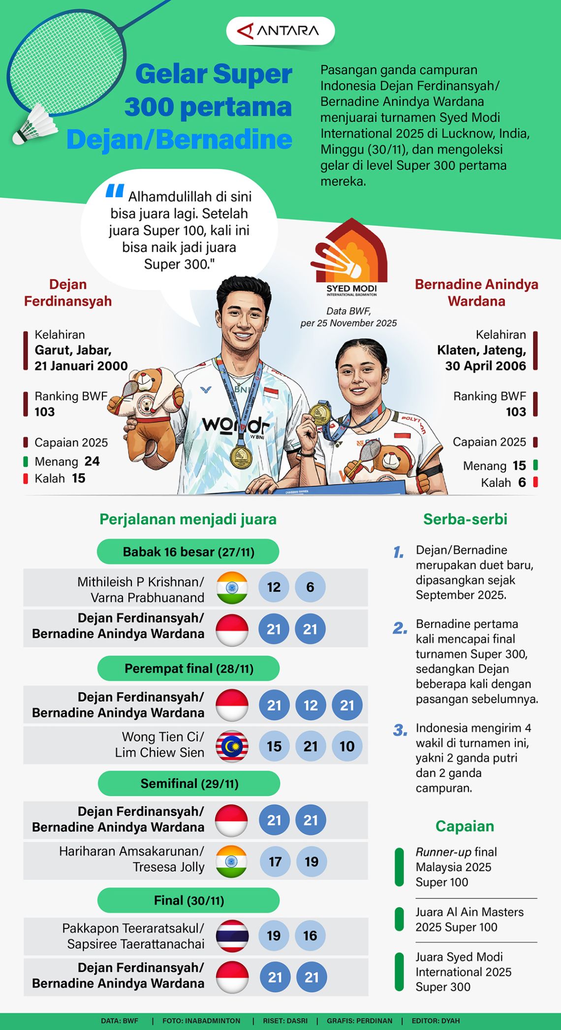 Pasangan ganda campuran Indonesia Dejan Ferdinansyah/Bernadine Anindya Wardana menjuarai turnamen Syed Modi Internasional 2025 di Lucknow, India, Minggu (30/11), dan mengoleksi gelar di level Super 300 pertama mereka.