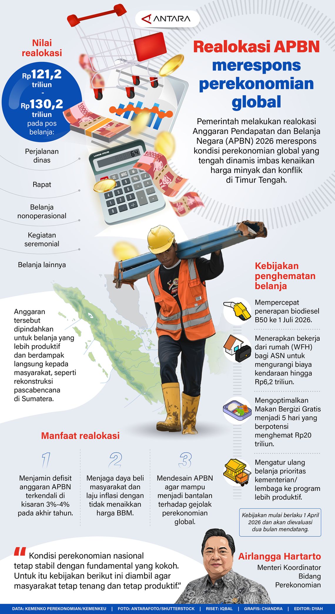 Pemerintah melakukan realokasi Anggaran Pendapatan dan Belanja Negara (APBN) 2026 merespons kondisi perekonomian global yang tengah dinamis imbas kenaikan harga minyak dan konflik di Timur Tengah.